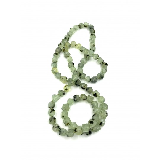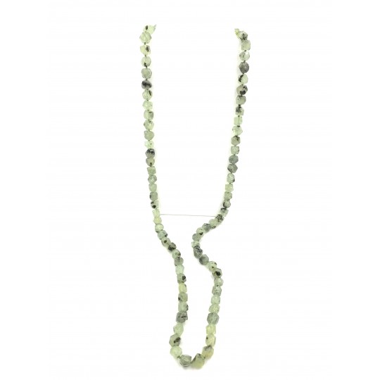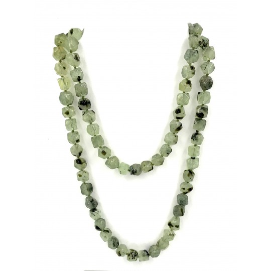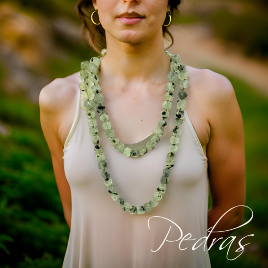Composto por magníficas pedras de frenite, este colar com pedras em formas irregulares de cerca de 14 mm leva-o numa viagem pelo esplendor das pérolas verdes. Este colar está disponível em um colar longo.Em um nível mental. A Prehnita ajuda você a ficar acordado e alerta quando estiver se sentindo mentalmente cansado. Use esta pedra para ajudá-lo a manter o foco e renovar seu foco no problema que o preocupa. É uma pedra perfeita para ajudar a se libertar da tagarelice incessante de sua mente. Ajuda você a organizar seus pensamentos e descobrir o que é realmente importante.Em um nível emocional. A Prehnita ajuda a lidar com a sensação de desconforto em tempos de mudança constante. Esta pedra transformacional pode ajudá-lo a ver e sentir como o fim de certas condições pode beneficiar a evolução do seu corpo, mente e alma. Ele abre sua consciência para ver o bem em todas as coisas.No nível físico. A Prehnita é útil para manter ossos, dentes, cabelos e unhas saudáveis. Amplifica a capacidade de suportar situações fisicamente estressantes por longos períodos de tempo em que a pessoa pode sentir sede e cansaço. Prehnite é benéfico para carreiras onde extrema atenção aos detalhes é necessária, como contadores, editores, cirurgiões, enfermeiras, costureiras e alfaiates.