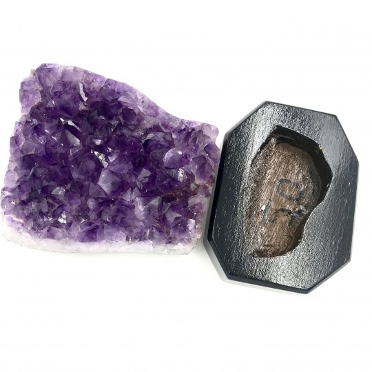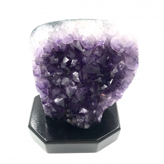 Drusa de Ametista do Brasil com base de madeiraNo nível mental. A vibração roxa da ametista é dotada de poderosas qualidades transformadoras. Para usar essa vibração com o propósito de transformar situações indesejadas, imagine que você está cercado por uma bolha vibrante e brilhante de luz roxa que emana da pedra. Enquanto você imagina, saiba que tudo o que o perturba ou lhe causa problemas está sendo transformado e transmutado em algo poderoso. Imagine a situação mudando para o que você deseja de onde está agora. A vibração da sua imaginação, dependendo do que você deseja que a sua vida combine com a luz roxa, afetará as mudanças.No nível emocional. Quando você percebe que suas emoções precisam ser transformadas ou drasticamente alteradas, a energia violeta da ametista lhe dá a força e os recursos para efetuar a mudança. Imagine estar cercado pela energia roxa desta pedra enquanto se concentra em como gostaria de se sentir.No nível físico. Como a ametista deriva seu nome da palavra grega amethystos, que significa “não bêbado” ou “não embriagado”, carregue ou use esta pedra para lembrar de evitar distrações prejudiciais e mudar hábitos antigos. intenção consciente. A associação com a embriaguez é inspirada em um mito romano que envolve Baco, o deus romano do vinho e da embriaguez. Cada vez que você toca a pedra ou olha para ela, imagine sua nova realidade como se esse velho hábito fosse uma memória distante. Como seria sua vida sem esse hábito? Aproveite o tempo para imaginar.