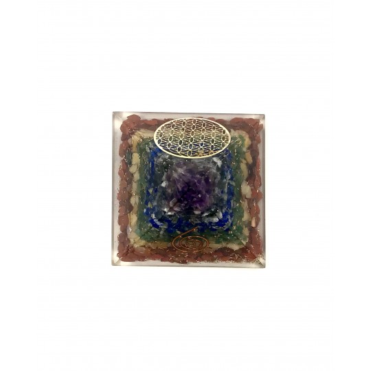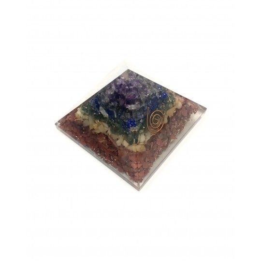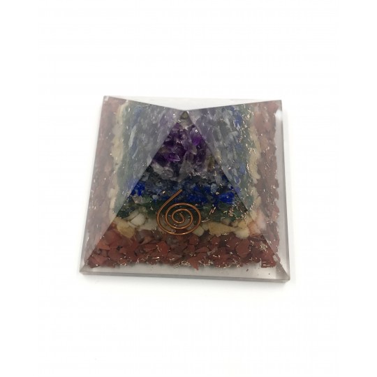 Pirâmide composta por pedras naturais ,resina e cobreEU SOU: o Chacra Raiz é o Centro de Sobrevivência; o recém-nascido deve sobreviver primeiro. Um bebê vive no presente, e a fragmentação da vida faz com que percamos essa graça. Temos que encontrar nossa Criança Interior novamente.EU SINTO: o Chacra Sagrado é o Centro do Desejo; aqui entra a dualidade e a lei emocional das aversões e atrações. Queremos ser aprovados e aceitos, temos medo de ser abandonados.EU QUERO: o Plexo Solar é nosso Sol Interior e o Centro de nossa Vontade; queremos dominar o mundo e, o que é bom, superar nossos medos. Não há amor aqui, mas todas as pressões da sociedade de consumo: dinheiro, poder, imagem.EU AMO: O Chacra do Coração é o Centro do Amor Incondicional e verdadeiramente a Ponte entre as nossas energias terrenas e as energias espirituais superiores. Aqui o amor se torna mais forte do que os medos primários, e descobrimos a virtude de dar.EU CONFIO: O Chacra da Garganta é o Centro de Confiança e governa nossa capacidade de expressão. Estamos nos abrindo para a Vida, e cada ser senciente, incluindo a Mãe Terra e o Cosmos, é a face do UM.EU VEJO: O Terceiro Olho é o Centro da Intuição. Aceitamos deixar ir e deixar ir, e não temos medo de olhar para o sol. Agora estamos cientes dos limites e perigos do ego e preferimos a intuição à mente.EU SEI: o Chacra Coronário é o Centro da Sabedoria (o número sete). Somos Um com o Universo. Começamos na Inocência como terminamos na Inocência. Princípio e fim, vida e morte, positivo e negativo são Um. Este é o Círculo da Verdade.