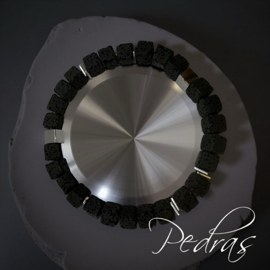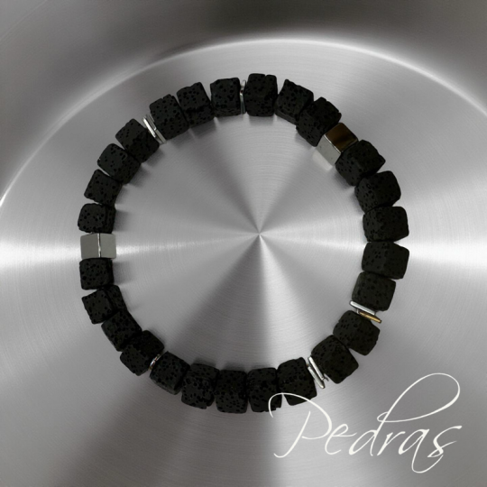 A pulseira é composta por pedras de lava quadradas de 6,5 mm e contas cúbicas em hematita galvanizada de 6 mm, acompanhada de quadrados planos de 6x1mm, esta joia única adiciona um toque refinado ao seu estilo.
