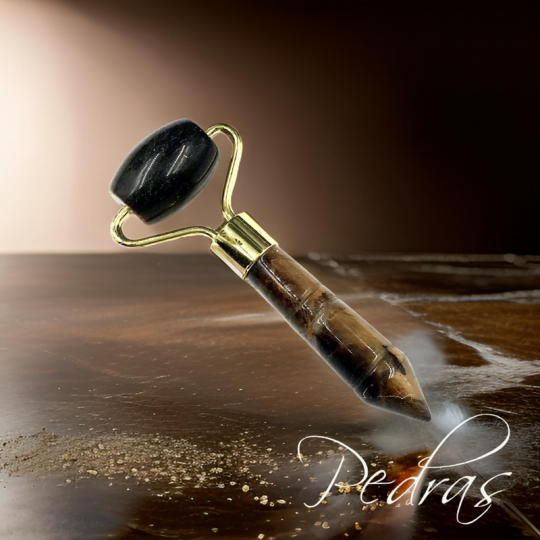 Rolo de massagem feito de Olho de Tigre polida à mãoReduz rugas e linhas finas,reduz o inchaço e as olheiras,libera a pele de toxinas e relaxa os músculos faciais, suporta o sistema linfático. Nos energiza com os beneficios do mineral.Em um nível mental. O Olho de Tigre permite clareza mental. Os tons amarelos iluminam e iluminam seu olhar sobre tudo o que é positivo e abre sua mente para possibilidades ilimitadas. Esta pedra é uma boa companhia quando tenta manter os pés no chão, focar nos seus objetivos e sonhos e em como alcançá-los. Isso pode ajudá-lo a se sentir fortalecido e não afetado pelas opiniões dos outros sobre como você deve agir e o que deve fazer. Isso ajuda a manter seus pensamentos alinhados com sua verdade pessoal.Em um nível emocional. O Olho de Tigre ajuda você a se libertar dos sentimentos de ciúme. Ao observar a natureza ou a fonte de seu ciúme, use esta pedra para concentrar sua atenção em aumentar sua autoconfiança. Essa pedra também o ajuda a controlar suas emoções em momentos de turbulência emocional. Ela o ajuda quando você precisar se lembrar que o sol continua a brilhar em você e que novos começos são tempos poderosos de renovação e crescimento.No nível físico. Como todas as pedras na categoria dos Olhos de Tigre, o olho de tigre dourado melhora sua visão. Esta pedra também auxilia na digestão e absorção dos alimentos para nutrição final. Use o olho de tigre para aumentar a força vital e melhorar a absorção da vitamina D com a ajuda do sol. Esta pedra também é benéfica para aqueles que desejam aprimorar sua carreira em uma posição de liderança ou como palestrante, supervisor ou gerente de projeto.
