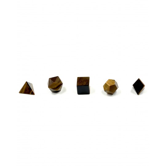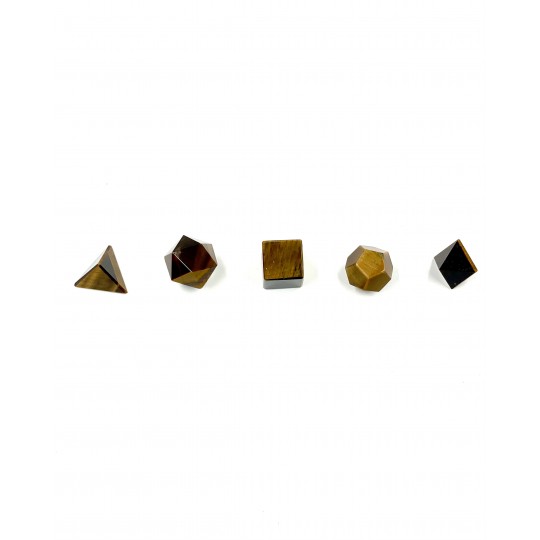 Sólidos de Platão Olho de Tigre 5 peçasEm um nível mental. O Olho de Tigre permite clareza mental. Os tons amarelos iluminam e iluminam seu olhar sobre tudo o que é positivo e abre sua mente para possibilidades ilimitadas. Esta pedra é uma boa companhia quando tenta manter os pés no chão, focar nos seus objetivos e sonhos e em como alcançá-los. Isso pode ajudá-lo a se sentir fortalecido e não afetado pelas opiniões dos outros sobre como você deve agir e o que deve fazer. Isso ajuda a manter seus pensamentos alinhados com sua verdade pessoal.Em um nível emocional. O Olho de Tigre ajuda você a se libertar dos sentimentos de ciúme. Ao observar a natureza ou a fonte de seu ciúme, use esta pedra para concentrar sua atenção em aumentar sua autoconfiança. Essa pedra também o ajuda a controlar suas emoções em momentos de turbulência emocional. Ela o ajuda quando você precisar se lembrar que o sol continua a brilhar em você e que novos começos são tempos poderosos de renovação e crescimento.No nível físico. Como todas as pedras na categoria dos Olhos de Tigre, o olho de tigre dourado melhora sua visão. Esta pedra também auxilia na digestão e absorção dos alimentos para nutrição final. Use o olho de tigre para aumentar a força vital e melhorar a absorção da vitamina D com a ajuda do sol. Esta pedra também é benéfica para aqueles que desejam aprimorar sua carreira em uma posição de liderança ou como palestrante, supervisor ou gerente de projeto.